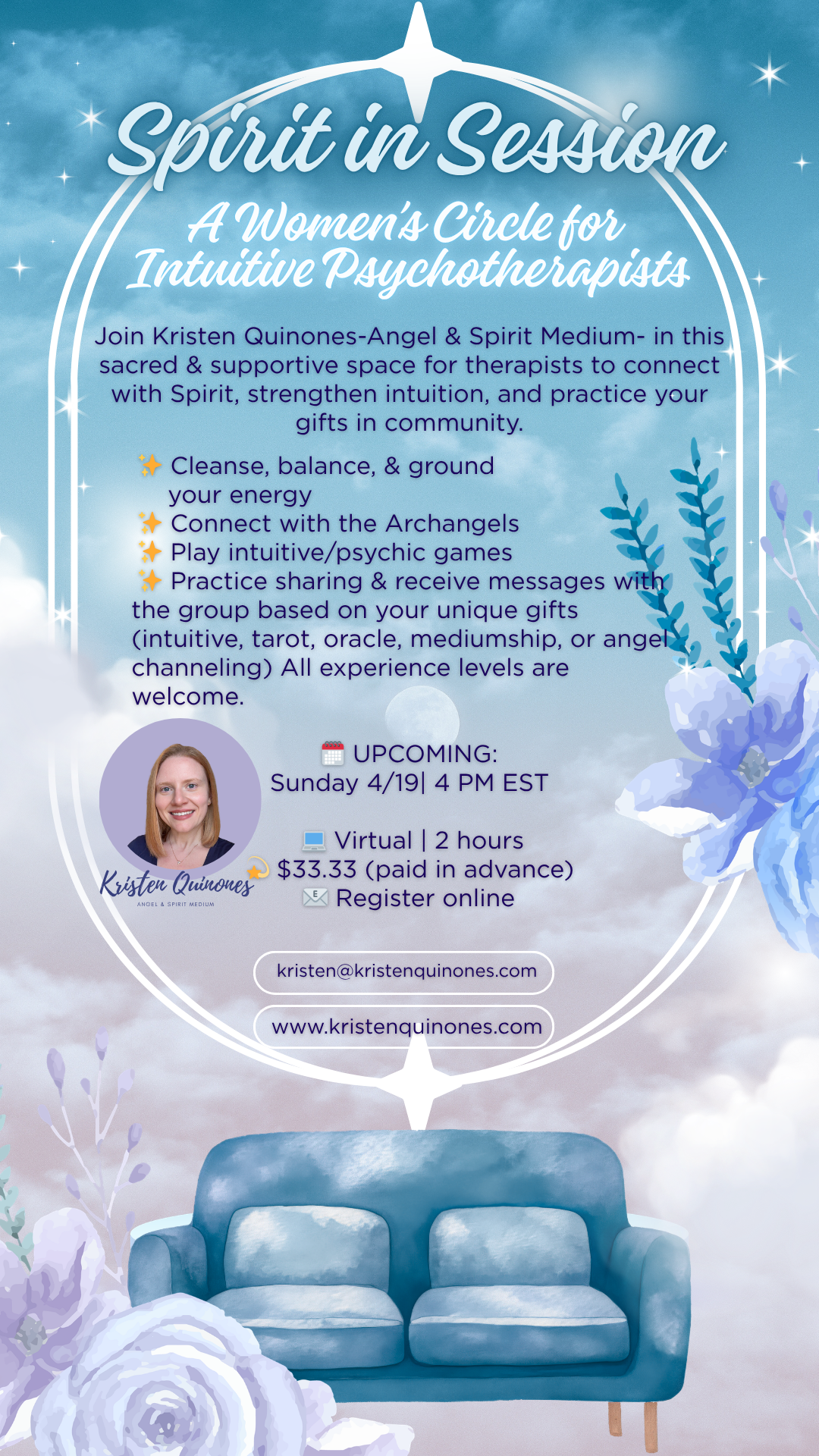 Join me for a 2-hour virtual women’s circle designed specifically for intuitive, spiritually curious, and energetically sensitive therapists who want to deepen their connection to Spirit while feeling supported and safe.